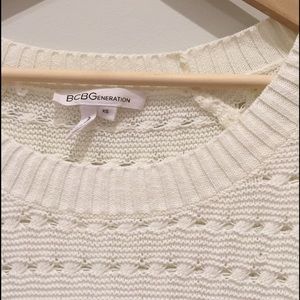 This creme sweater is a great slightly oversized sweater to wear with a tank top or long sleeved top underneath. Never been worn.