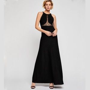 Gorgeous sleek and edgy sleeveless maxi dress that features semi-sheer floral lace insets and a keyhole back. With a concealed center back zipper and hook-and-eye closures. Has some pilling at the bottom from storage but it’s brand new.