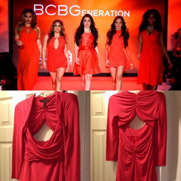 Criss cross bust & criss cross open back. Polyester and spandex. Body fitting. Inside lined. New flawless condition. Beautiful dress. Thank you