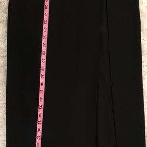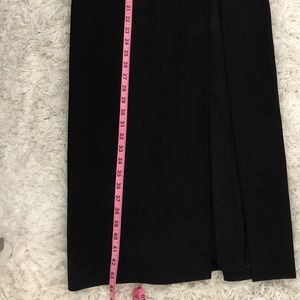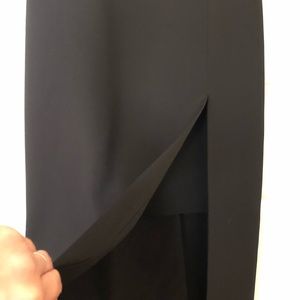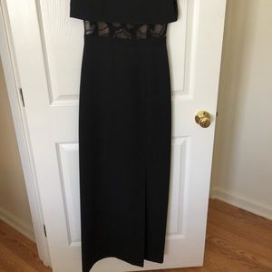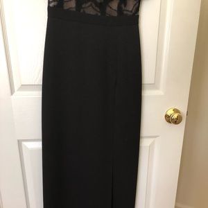 Long black dress with thigh high split. Has a short skirt underneath. Nude and black mesh in middrift area. Classy and a little sexy dress. Perfect for wedding or other special occasions. Worn 2x received a ton of compliments.