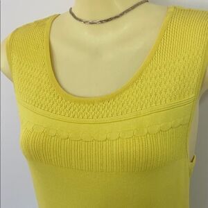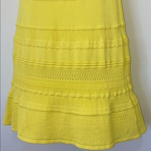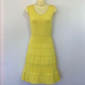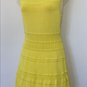 From The House of BCBG MAXAZRIA here is the Amazing “WILMA” Dress. It is don in a soft shade of lemon. This dress features a round neck and is fitted throughout the waist. It is done with Rayon/ Nylon/ Spandex Yarn in a Banded Multi Stitch.Light and Comfy~Pull over style and knee length New With Tags! Sz Sm
