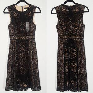 Beautiful BCBG Max Azaria Dariella Dress. Black lace with a nude liner. Sleeveless with a flattering soft A-Line skirt.