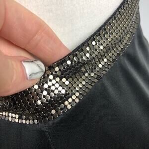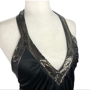 BCBGMaxAzria low cut plunging halter girls night out Black Mini Dress Silver Metal mesh trim & strap, Halter with very low cut back and ruching front. Size XS