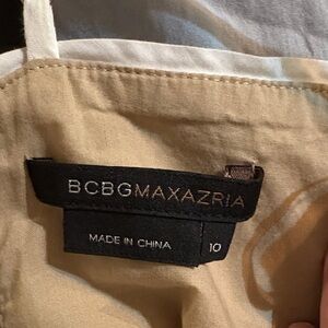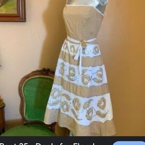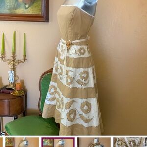 BCBG Dress Y2K Beige and Cream Strappy Tea Dress with Silver Floral Sequin