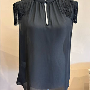 BCBG Eneration Black Fringe Sleeveless Top with Keyhole Detail.