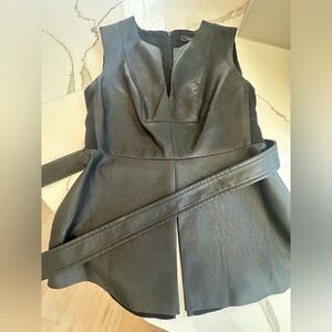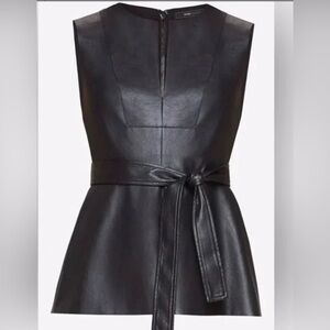 BCBGMAXAZRIA’s smooth supple faux leather top is the perfect staple. Love the waist defining belt. Ponte knit panels beneath armholes provide an effortless fit. Split neckline, sleeveless, top stitched bib detail. Concealed zip back.