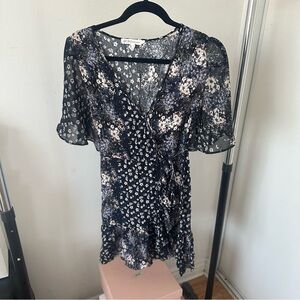 Chic floral wrap blouse with V-neck. Sheer sleeves add elegance. Perfect for versatile styling.