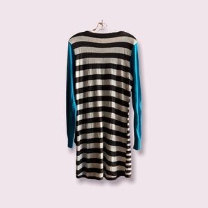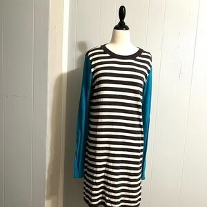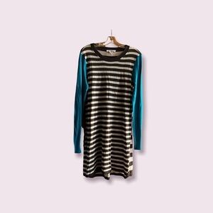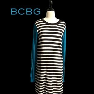 BCBG GENERATION SWEATER DRESS SIZE L. GRAY & CREAM STRIPES WITH TEAL SLEEVES. VERY SOFT, LIKE NEW. NO FUZZ OR PILLING.