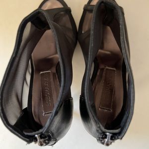 A leather and mesh melange of edge and femininity in basic black. A half-inch platform slightly lessens the 4” heel. Back zippers aid easy slip-on. No sign of inside wear at all! Leather sole intact; slight sign of wear on sole (black color on sole leather). Perfect for dressy holiday parties!