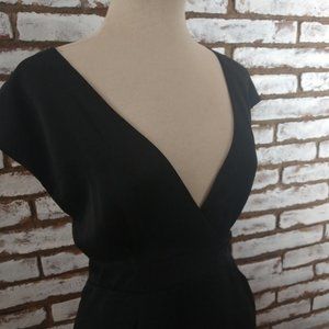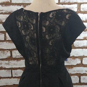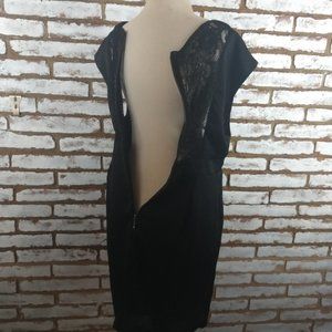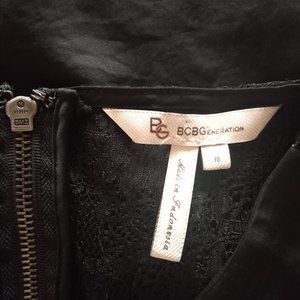 Gently Pre-Owned. BCBG Black Dress w Back Lace Detail Size 10. Has Back Zip and feels like Silk. Made of Poly. Beautiful! Please review measurements carefully. B#2 028