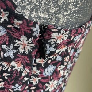 Elegant black dress with floral pattern Features a stylish V-neck design with black lace detailing and two ruffle layers. Side zip and dress is lined in black fabric.