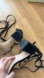 BCBG Generation Black Sandals Mid Block Heels Lace up Faux Suede