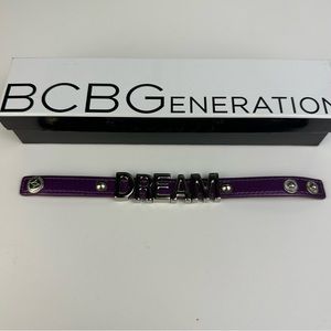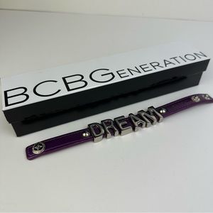 BCBG Generation ‘Dream’ Affirmation Bracelet Snap Cuff Purple Silver Tone w/ Box
