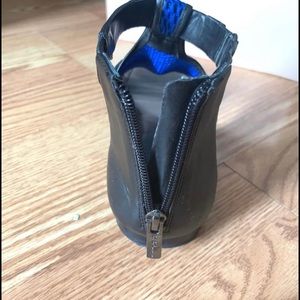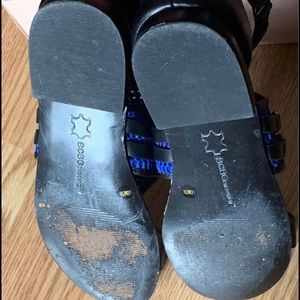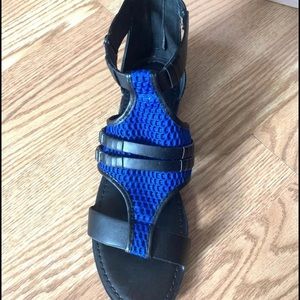 Women’s BCBG Generation Black & Blue Flat Sandal with Python Mesh. Size 8.5. Condition is Pre-owned and still has the box. Bottoms of shoes show signs of wear but the top parts look barely worn. Please see all photos for they serve as part of the description.