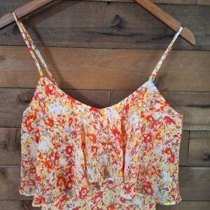 Light and airy, this beautiful mini dress features a vibrant floral print in shades of orange, yellow, and red. The adjustable spaghetti straps and ruffled overlay detail add a touch of femininity, while the flowy asymmetrical hemline ensures a flattering fit. Perfect for summer outings, vacations, or casual events.