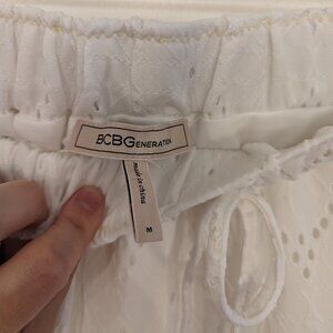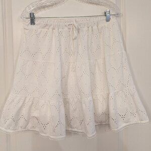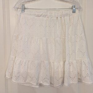 Clothing description: White mini lace skirt, 3 tier, Ruffles, elastic and adjustable band, includes lining