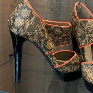 BCBG Generation Brown With Orange trim Snakeskin/python 4inch Open Toe Heels.