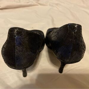Pre-owned BCBG Generation Ariel heels, size 8, in blue and black. Open toe style with a leather upper and manmade balance. The color is Blue Sapphire Winter Snake.