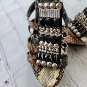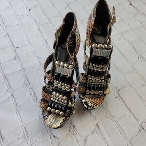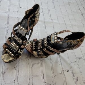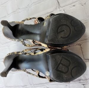 BCBG Generation strappy heels features faux snake and metal medley for smoking hot shoe! 4.5" heel, 1" platform, side ankle buckle and lightly padded foot bed, previously owned, minimal signs of wear, see pic 10, lots more stylish wear to go