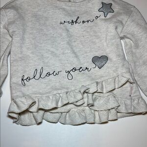 BCBG Girls French Terry Ruffle Top Size 18 Months. Features include elastic wristbands, ruffle hemline for a fun and flattering fit, button closure on back, French terry material, neutral color, “with on a star, follow your heart” logo on front. 57% Cotton 43% PolyesterGood worn condition, no notable flaws. Smoke free home.