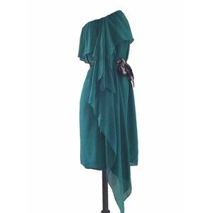 Turn heads in this BCBG silk chiffon cocktail dress in a stunning shade of emerald green. Designed with a strapless neckline and light, airy layers, this piece embodies effortless elegance. Perfect for cocktail parties, weddings, or holiday events, it offers a timeless silhouette with a playful, flirty edge.