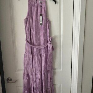 Design details: crinkled design, tiered skirt, and self-tie sash at waist
