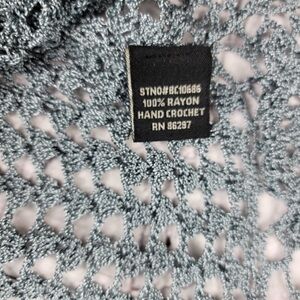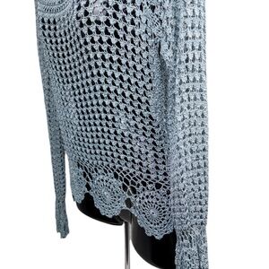Stylish and stunning, light blue/gray hand crochet sweater, top with intricate patterns. Perfect for layering, or even a beach coverup in rayon.