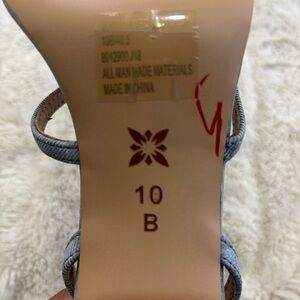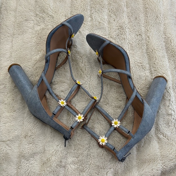 BCBG Jordan Cage Sandals Denim Strappy Heels with Daisy Floral Accents Size 10
