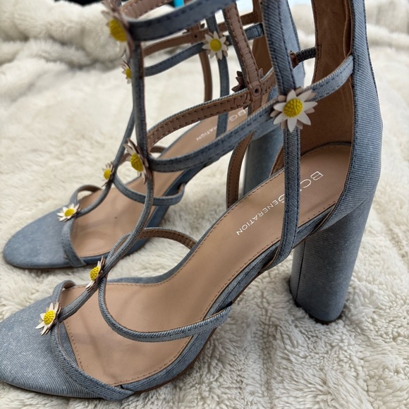 Step out in style with these BCBGeneration whimsy chic blue denim strappy heels, featuring charming daisy floral accents, these shoes are perfect for adding a playful touch to any outfit.