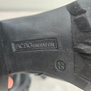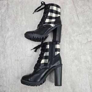 BCBG Lace Up High Heel Boots Plaid Black White Preppy Combat Hiker Boots Sz 5.5
