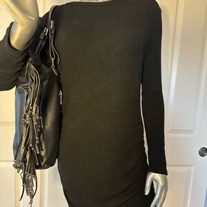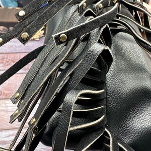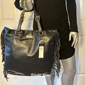 Stylish and versatile, the BCBG Black Studded Fringe Tote Bag is perfect for any occasion. Featuring a sleek black design with fringe details, and roomy soft vegan leather. Has back zipper pocket, inner zipper pocket and open inner pockets. Footed at bottom for sturdiness. Adjustable length buckle shoulder straps.