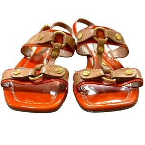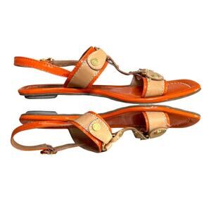 BCBG Leather Flats Ankle Strap Sandals Womens Size 6.5 Orange Tan Gold