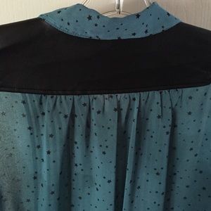 Long sleeve top with leather sleeve cuffs and shoulder/back. Thin see through material with cute star prints. Loose summer fitting, detailed front seams. Great condition, worn only once!
