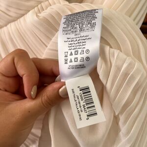 white pleated tank top, faux wrap front, asymmetrical handkerchief hem