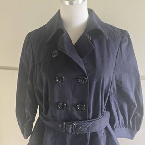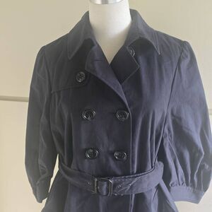 BCBG MAX AZRIA DARK NAVY "ALEXANDRA" Trench Coat, 3/4 Sleeve, Swing Back, Double Breast, Front Pockets, Self Fabric Belt.