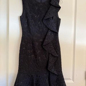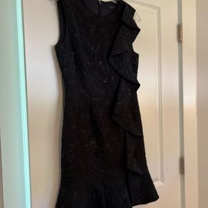 BCBG Navy Cocktail dress too formal evening. Material has a a design on it with a bit of shine. Ruffle on side of dress and bottom. Very flattering.