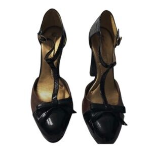 Beautiful leather T-strap heels Black patent leather heel and toe Cute patent leather bow at the toe 7.5 Made in Brazil Great vintage/ retro look