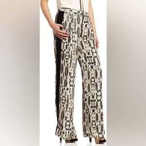 Elevate your wardrobe with this striking BCBG MAXAZRIA 2-Piece Suit in a bold Black/Combo abstract print. Featuring a tailored blazer with sharp lapels and sleek piping details, paired with high-waisted wide-leg pants that elongate the silhouette. Perfect for making a confident statement at the office or a chic event, this set delivers designer style with standout flair.