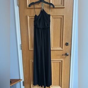 Stunning and sophisticated BCBGMAXAZRIA black maxi dress featuring a dramatic gold chain halter neckline and elegant draped bodice. Fitted waist and flowing skirt with a subtle front slit. Made from a soft, slinky fabric that moves beautifully. Perfect for weddings, galas, or any special evening event.