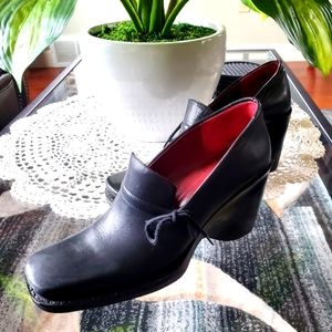 BCBG MAXAZRIA Closed Toe Black Wedge Heels (Approx. 3 1/4".) Size 6. Beautiful condition. These shoes are gorgeous and sophisticated looking. Solid black with a small upper flap and small ties on the exterior ... and sturdy sweet heels for support and comfort. If you're on your feet all day, these BCBG's are the PERFECT fit. If I had deliciously small feet, I'd claim them.