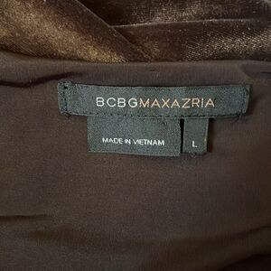 BCBG MAXAZRIA Bodycon side ruched chocolate brown Velvet Dress Sz L. Interesting asymmetrical neckline. This stunning BCBMAXAZRIA bodycon velvet dress is a must-have for any fashion-forward woman. The dress is crafted from high-quality velvet fabric, making it soft and comfortable to wear. It comes in a size L and features a flattering bodycon style that enhances your curves in all the right places. The dress is perfect for any occasion, whether you're attending a formal event or a night out with friends. It features stretchy polyester and spandex material, allowing you to move freely and comfortably. Shelf bra inside. MIDI length. BCBGMAXAZRIA is known for its high-quality and stylish clothing. Get ready to turn heads in this stunning dress!