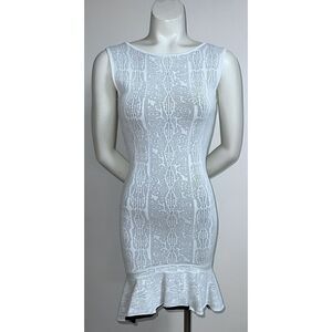 Complement your fabulous form with this irresistible dress silhouette in feminine lace jacquard.Boatneck. Sleeveless. Princess seams.Lace jacquard throughout. Scoop back. Skirted hemline with center back vent.Hits above the knee.Body-con fit.Dry Clean OnlyFlat Measurements:Bust: 14.5"Length: 34"