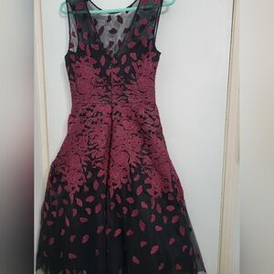 BCBG MAXAZRIA Floral Embroidered Black and Burgundy Aline Midi Dress Size 4