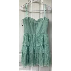 BCBG MAXAZRIA LILAH TIERED LACE STRAPLESS DRESS MSRP $368 NWOT Opaline Green Coquette prom, homecoming, cocktail, formal, semi formal, wedding, event, date, medium BCBGMAXAZRIA