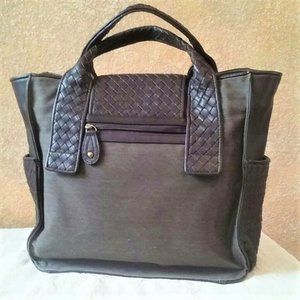 Versatile leather/ canvas tote from BCBG. Great quality supple leather basket weave design handles and trim. Textured canvas front and back panels. Very roomy bag with magnet flap closure, one large compartment with zip closure, one pocket with zipper closure, and two smaller pockets inside. One zip-closed pocket outside, two side compartments with magnet closures.