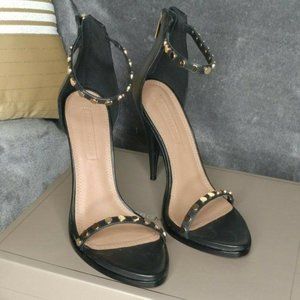 Studded details, Open toe, Leather with contrasting manmade construction, Flat stud detail, Elasticized ankle strap, Concealed zip closure, Tapered cone heel, Approx. 4.75" heel