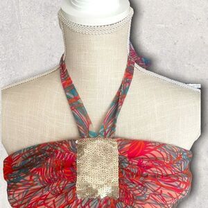 BCBG MAXAZRIA | NWT JEWELED FRONT LAYERE Tie Neck Dress In Flame Size 12