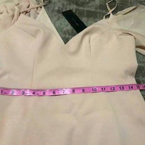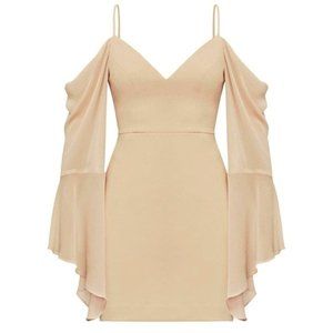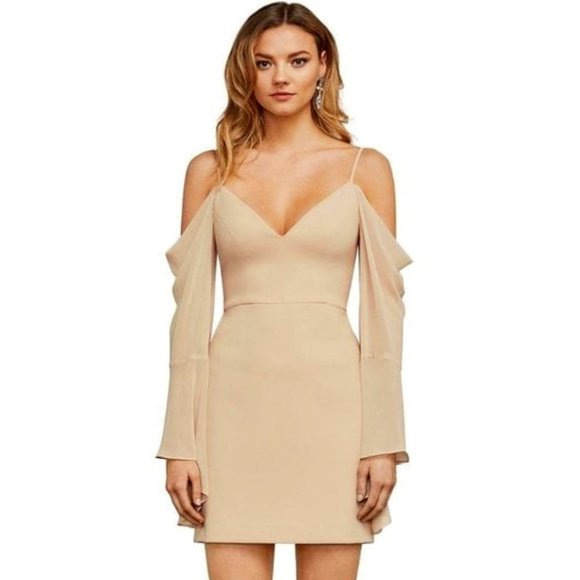 Gorgeous sheer sleeve Bcbgmaxazria dress. Color is a pale pink. Straps are adjustable. Sold-out hard to find. Size 8 NEW WITH TAGS. Hips measure 19 inches and waist 15 inches.