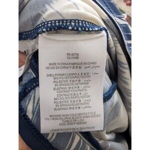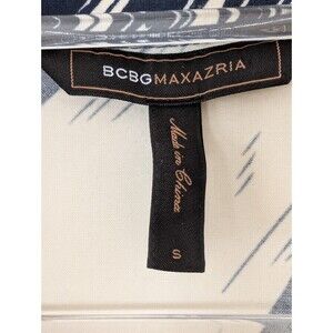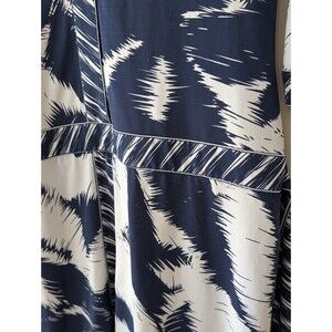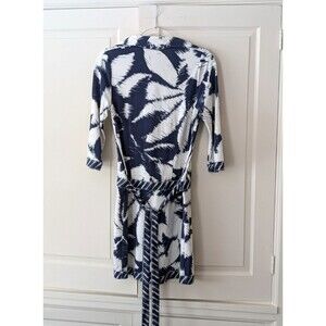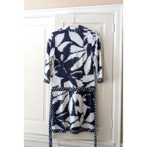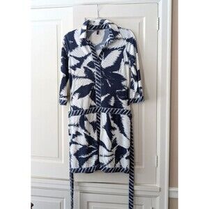 This BCBG MAXAZRIA dress in size small features an abstract blue and cream palm leaf print with a coordinating print on the belt, hem, and placket. The belted drop-waist stye with a split V-neck, collar, and 3/4 sleeves gives it a casual yet stylish look, ideal for travel, parties, or casual occasions. It packs small and won't wrinkle. Made from a comfortable, silky polyester and spandex blend jersey fabric, this knee-length dress is easy to care for with machine washable instructions. Wears like a shirt dress/wrap dress/belted tunic mash up.