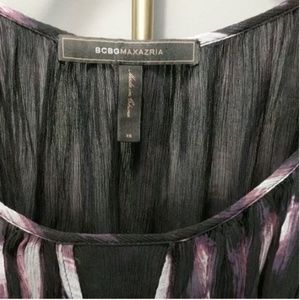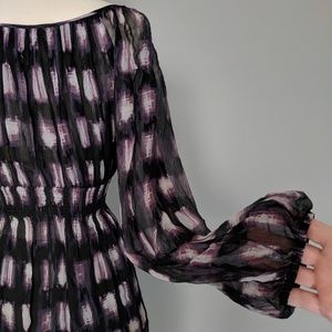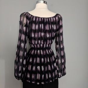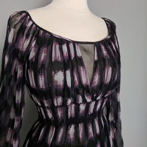 For over 30 years, BCBGMAXAZRIA has been a premier fashion resource w/designs coveted, worn & loved by an elite clientele. This semi-sheer empire waist top features a peek-a-boo dart & smocking below the bust for a comfortable fit. Slightly puffed sleeves with elastic. In a beautiful lightweight silk abstract print design.